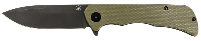 The Templar Knife Paladin is a 3.27" drop point folding knife featuring a black powder coated D2 steel blade and green canvas micarta handle. With an overall length of 7.67" when open and ceramic ball bearing pivot, this folder is designed for general cutting tasks and everyday carry. The plain edge blade and durable construction make it a reliable choice for outdoor and utility use.