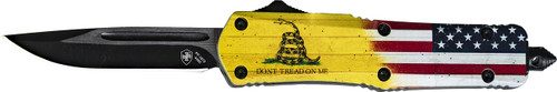 Out-of-the-front (OTF) folding knife featuring a 2.69" plain edge 440C stainless steel blade with black oxide finish. The 4.25" yellow aluminum handle displays a flag and "Don't Tread On Me" design, includes a glass breaker, and has an overall length of 7" when open.
