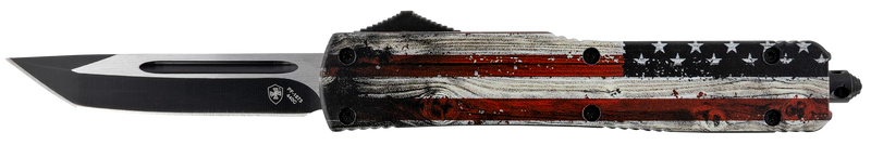 Out-of-the-front (OTF) automatic knife with a 3.43" 440C stainless steel tanto blade and double-action mechanism featuring a built-in safety that stops deployment if resistance is met. Handle is aluminum alloy with painted wood grain US flag design, includes a glass breaker and pocket clip, and ships with a nylon sheath.