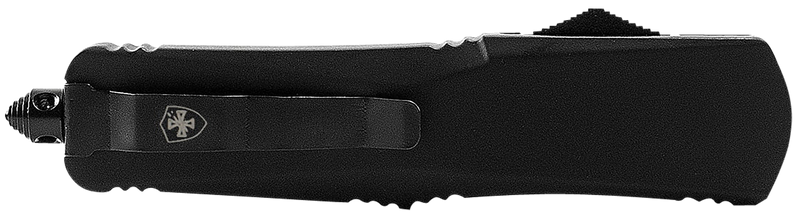 The Templar Knife SBR431 Gen II is a small out-of-the-front (OTF) automatic knife featuring a 2.69" 440C stainless steel dagger blade with partial serration and black oxide stonewashed finish. The knife includes a 4.31" black aluminum/rubber handle, glass breaker, pocket clip, and comes with a nylon sheath. Assembled in the USA with a manufacturer lifetime warranty.
