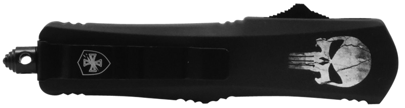 This is a spring-assist out-of-the-front (OTF) knife featuring a 2.69" 440C stainless steel tanto blade with plain edge and powder coating. The 7" overall length knife has a black aluminum handle with skull design, includes a glass breaker, and comes with a nylon sheath. The knife is manually assembled, tested, and inspected in the USA with a manufacturer lifetime warranty.