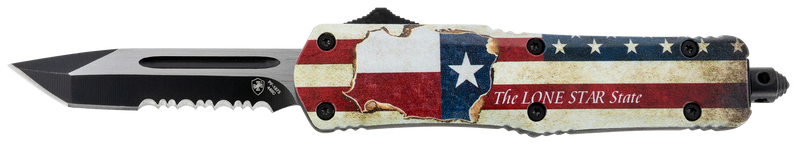The Templar Knife STX531 Gen II Texan Small is a 2.25" OTF (out-the-front) knife featuring a tanto blade with partial serration in 440C stainless steel with black oxide stonewash finish. The 4.31" aluminum handle displays a Texas flag design and includes a glass breaker, with slider button operation for reliable deployment.