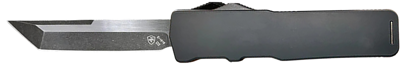 The Templar Knife XSBR221 is a premium out-the-front (OTF) tanto blade knife featuring a 3" D2 steel blade with black oxide stonewashed finish and plain edge. The 4.50" black aluminum handle provides a comfortable grip with button-actuated deployment, and the knife has an overall length of 7.50" when fully extended.