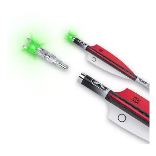 These carbon arrows feature Alpha-Blaze lighted nocks that activate upon firing from a crossbow, providing bright illumination at shot for improved visibility. Each arrow is 20" in length and weighs 410 grains, with the package containing 36 arrows designed to maintain consistent point of impact with unlighted arrow counterparts.