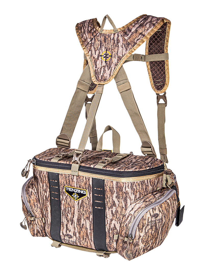 The Tenzing Hangtime Lumbar Pack is an EVA-molded waist pack designed for hunters and shooters who need mobility in tight spaces like tree stands and ground blinds. The pack features an innovative design that hangs open while maintaining its shape, with adjustable straps to customize fit for different gear configurations. Dimensions are 16" x 7.5" x 10", weighing 1.8 lbs, backed by a manufacturer's limited lifetime warranty.