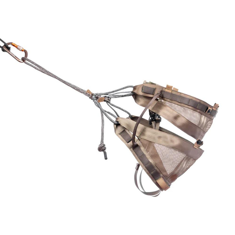 The Carnivore 2P is a lightweight tree saddle designed for comfort during extended hunts on public or private land. Features an integrated RAD system for silent deployment of the bottom panel, patent-pending Quad Lock UtiliBridge for adjustability, and a 300 lb weight limit. Constructed from durable nylon with a low-drag profile and weighs 2.4 lbs.