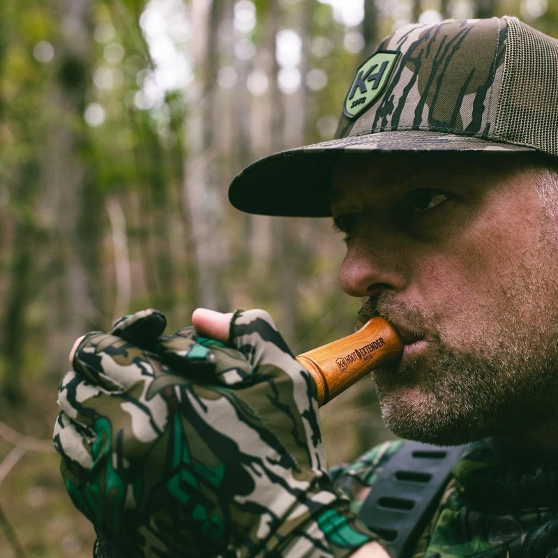 The Hoot Extender is a mouth call designed to mimic owl hoots for locating turkeys on the roost during early morning or dusk hunts. This tool helps pinpoint gobbler positions by triggering responses from roosted birds. Requires practice to fine-tune volume and rhythm for effective use.