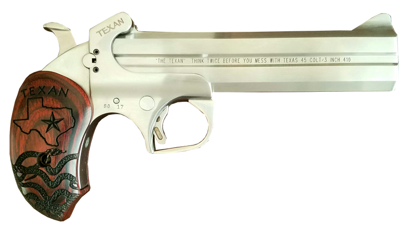 The Bond Arms Texan is a dual-caliber break-action derringer chambered in .45 Colt and .410 gauge (3" chamber) with a 6" stainless steel barrel and frame. It features fixed blade front and rear sights, an automatic spent casing extractor, patented rebounding hammer, and a cross-bolt safety. The extended rosewood grip is custom engraved with a Texas state outline and weighs 27.2 oz.