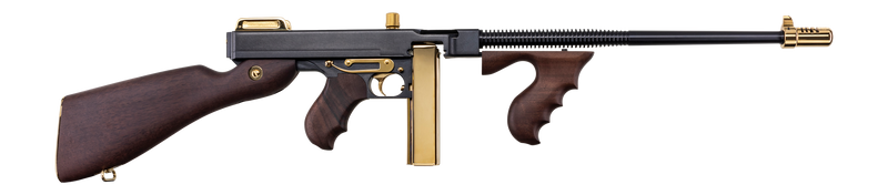 The Thompson 1927A-1 is a semi-automatic rifle chambered in 45 ACP with an 18" finned barrel and 20+1 round capacity. This deluxe model features a milled steel frame, walnut fixed stock, adjustable rear sight, and a Cutts compensator. It accepts both stick and drum magazines and weighs 13 lbs with an overall length of 42.5".