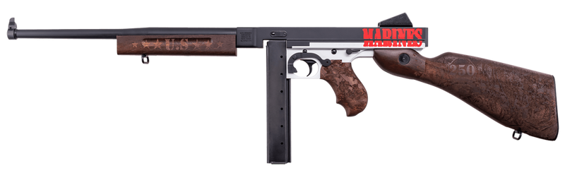 Semi-auto rifle chambered in 45 ACP with a 16.5" barrel and 30+1 round capacity. Features a midnight blue cerakote barrel, two-tone midnight blue and stormtrooper white cerakote steel receiver, and engraved walnut fixed stock and grip. This Marines 250th Anniversary commemorative edition weighs 11.5 lbs with an overall length of 38" and fixed blade front/battle rear sights.