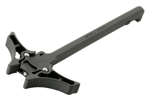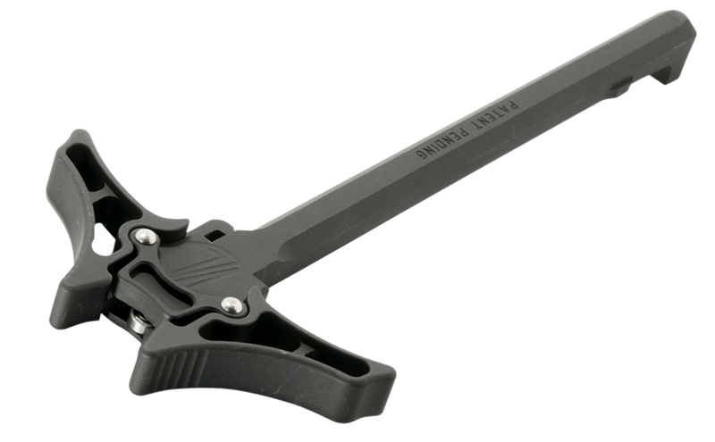The Enforcer is an ambidextrous charging handle designed for AR-platform rifles, constructed from hardcoat anodized aluminum for durability and corrosion resistance. Dimensions are 9.1" length x 5.2" width x 0.7" height. This accessory provides ergonomic control from either side of the rifle and installs on standard AR charging handle receivers.