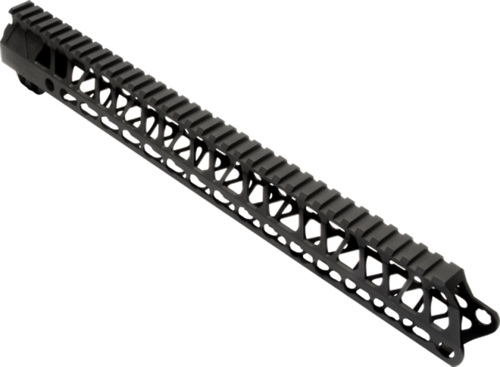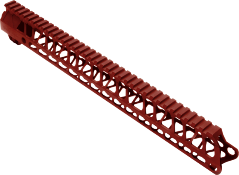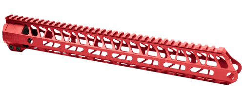 The Enforcer is a 15-inch free-floating handguard for AR-15 rifles constructed from red anodized aluminum with integrated Picatinny rail and M-LOK slots for mounting accessories. This handguard features a slim profile (2.7" width, 1.7" height) and is designed for direct mounting to the AR-15 platform with standard installation methods.
