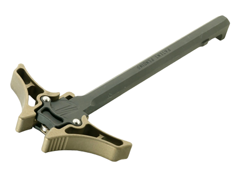 The Timber Creek Outdoors Enforcer is an ambidextrous charging handle designed for AR-10 platform rifles, machined from billet aluminum with a burnt bronze finish. This charging handle features a wide, ergonomic design measuring 12.6" in length with a 7.7" width, providing enhanced grip and control during operation. The ambidextrous configuration allows for operation from either shoulder, making it suitable for both right and left-handed shooters.