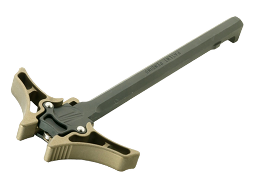 The Enforcer is an ambidextrous charging handle designed for AR-10 rifles, machined from billet aluminum for durability and lightweight performance. Measures 12.3" in length with a 5.1" width and 0.8" height, providing ergonomic control for both left and right-handed shooters. Direct replacement installation on AR-10 platforms.
