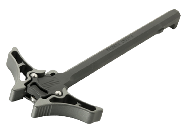 The Enforcer is an ambidextrous charging handle designed for AR-10 platforms, machined from tungsten billet aluminum for durability and reliability. This charging handle measures 12.6" in length with a 7.5" width and 0.9" height, providing ergonomic control for left and right-handed shooters. Installation is direct and compatible with standard AR-10 upper receivers.