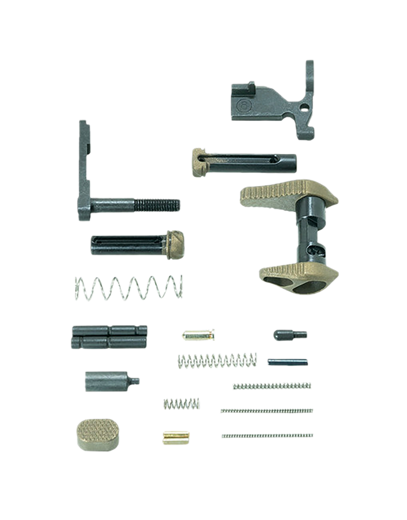 Complete AR-15 lower parts kit manufactured from burnt bronze anodized aluminum. Kit includes all necessary small parts for assembling an AR lower receiver. Designed for ambidextrous operation and standard mil-spec AR platforms.