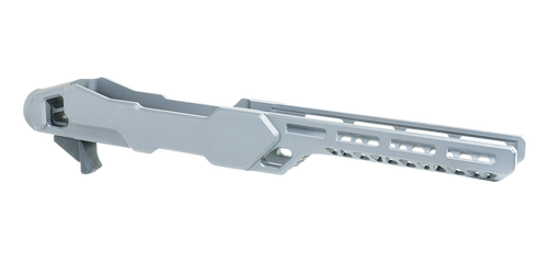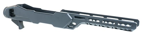 The Enforcer rifle chassis is a lightweight aluminum chassis system designed for Ruger 10/22 rifles and compatible with MSR buffer tubes. Constructed from burnt bronze anodized aluminum, it features compact dimensions (18.1" length, 4.0" width, 2.3" height) and provides a modern platform for customization and upgrades.