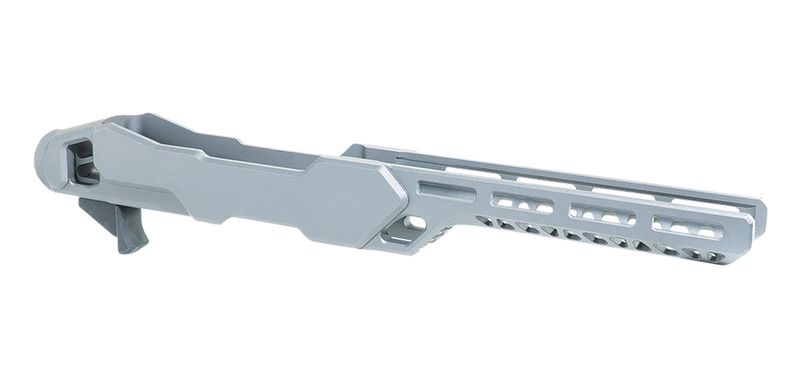 The Enforcer Rifle Chassis is a tungsten aluminum chassis designed specifically for Ruger 10/22 rifles. It features compatibility with MSR buffer tubes and measures 18.1" in length, providing a modern platform for customization and upgrade of the 10/22 platform.