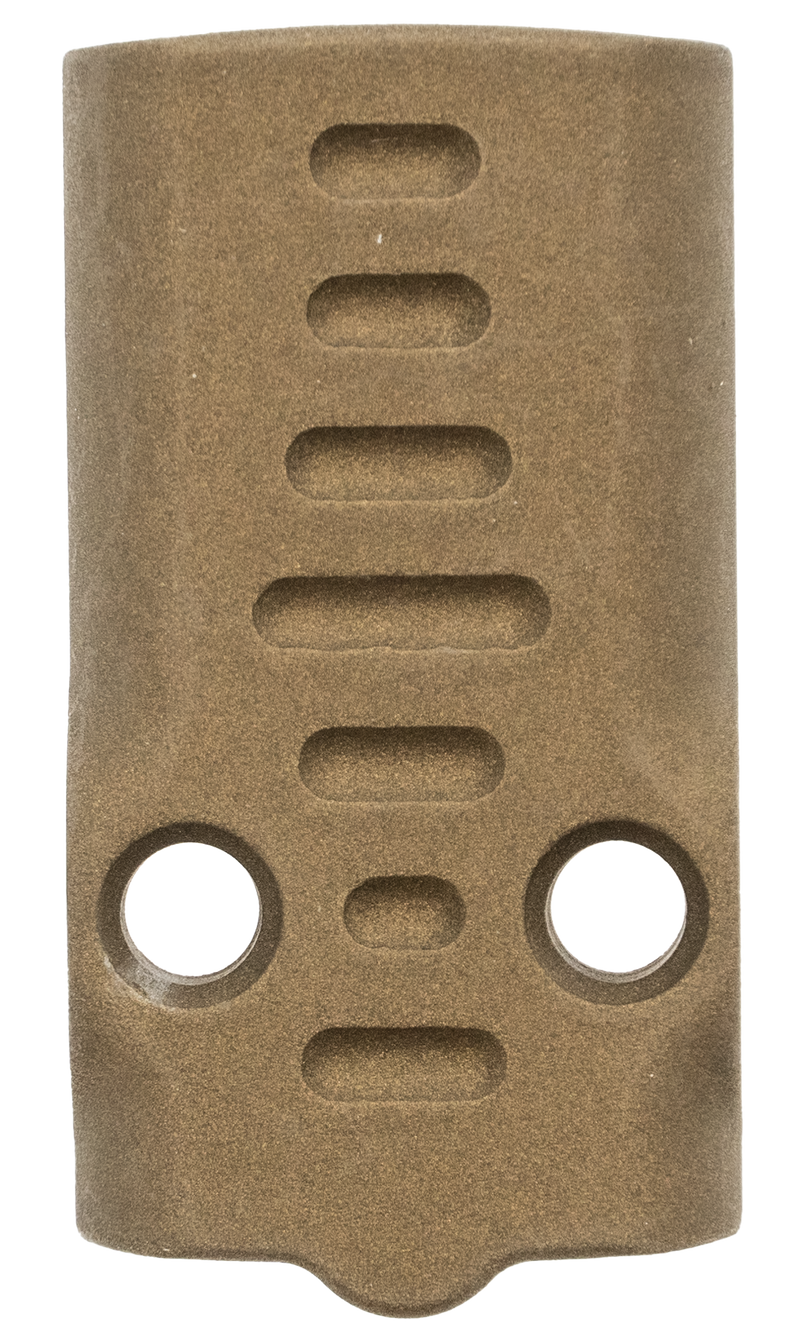 Aftermarket slide cover plate designed for Glock 43X and Glock 48 pistols. Features a burnt bronze finish and replaces the factory cover plate for a customized appearance. Dimensions: 4.2" length x 2.6" width x 0.1" height.