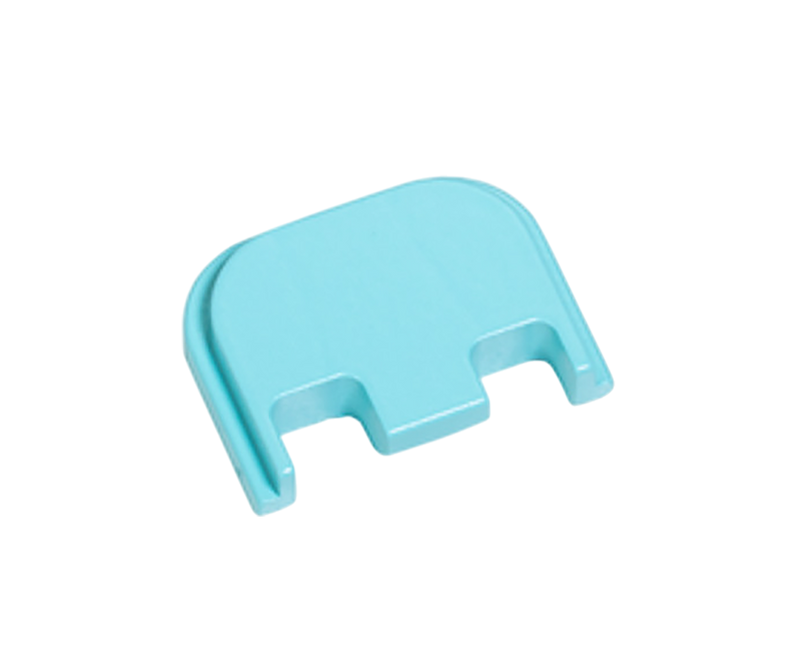Precision-machined aluminum slide cover plate designed for Glock 43X and 48 pistols. Features a robin's egg blue finish and measures 4.2" in length with a 2.6" width. This accessory replaces the factory cover plate for customization and enhanced aesthetics.