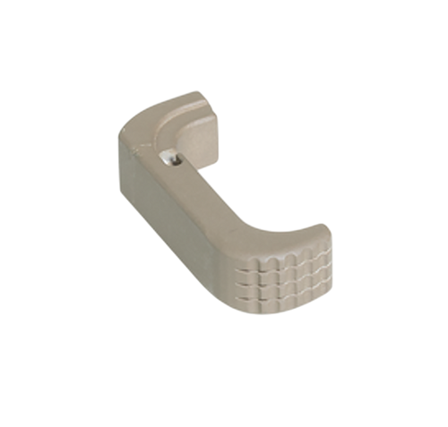 Extended magazine release for Glock 17/19 pistols constructed from anodized aluminum in Flat Dark Earth finish. Dimensions: 4.3" length x 2.6" width x 0.3" height. This aftermarket accessory improves ergonomics and speed of magazine changes.