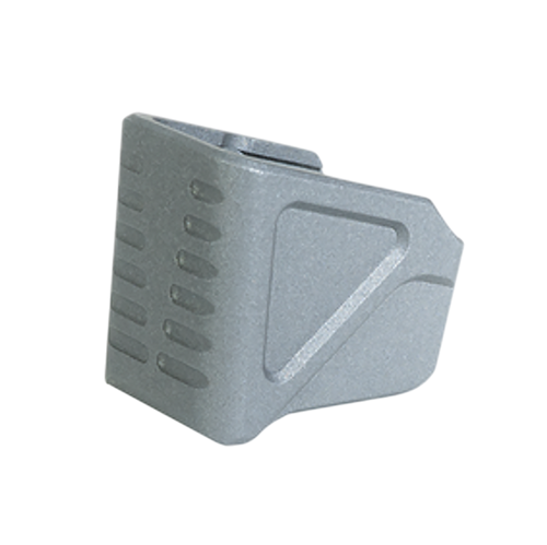 This magazine extension plate is designed for Glock 17 and Glock 19 pistols and is constructed from anodized aluminum in a burnt bronze finish. The extension plate measures 4.8" in length, 3.6" in width, and 1.4" in height, providing a durable accessory for magazine customization.