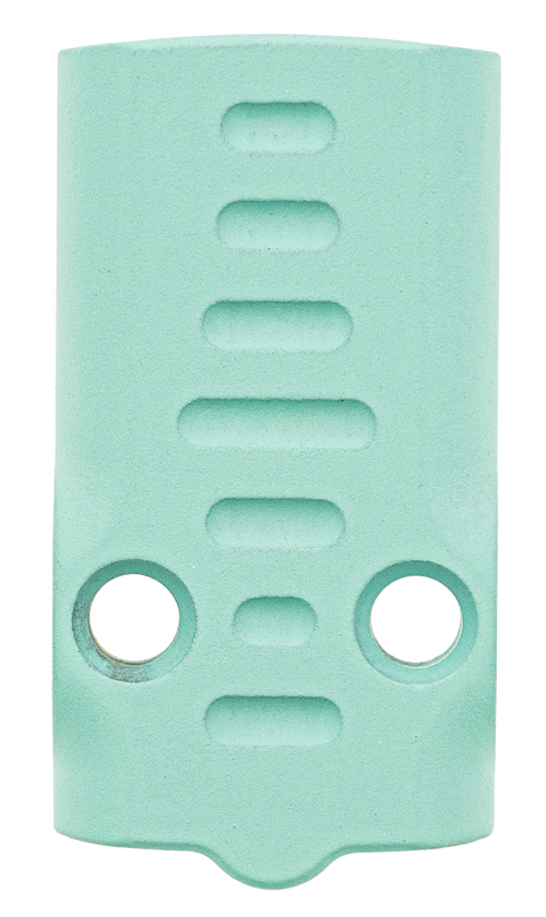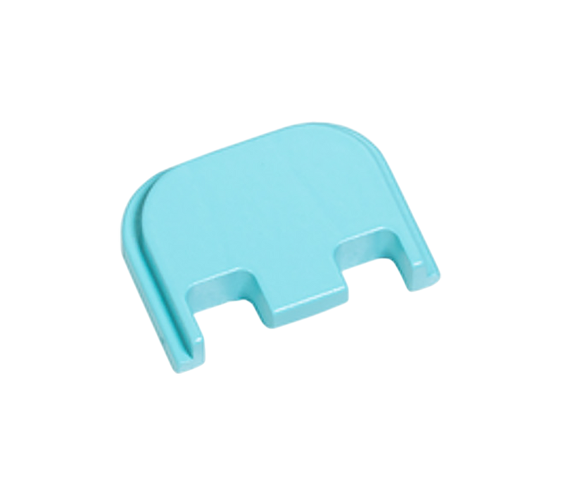 Aluminum slide cover plate designed for Glock 17/19 pistols. Features robin's egg blue anodized finish. Dimensions are 4.3" length x 2.6" width x 0.3" height.