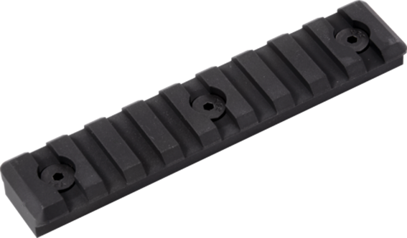 This M-LOK 9 Slot Picatinny Rail from Timber Creek Outdoors is a 5.5" aluminum accessory rail designed for M-LOK compatible handguards and systems. The black anodized finish provides corrosion resistance, and the rail measures 3.7" wide by 1.1" high, allowing secure mounting of optics, lights, and other tactical accessories via standard Picatinny slots.