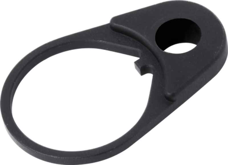 Quick detach end plate designed for AR-15/AR platform rifles with ambidextrous QD socket compatibility. Made from hardcoat anodized aluminum for durability and corrosion resistance. Measures 4.8" long x 2.6" wide x 0.2" tall and replaces standard buffer tube end plates to accept QD sling attachments.