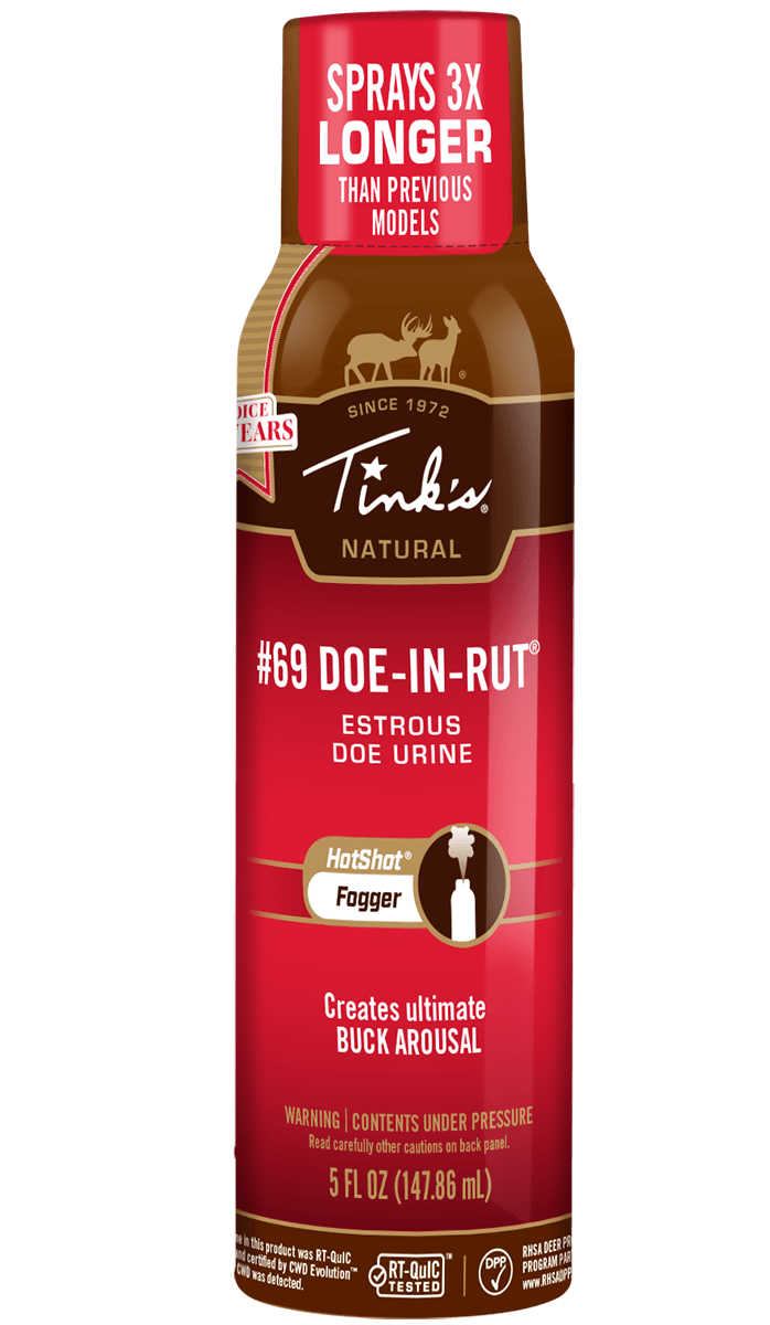 This 5 oz aerosol fogger disperses 100% pure doe estrus scent using an innovative Bag-On-Valve system designed to attract deer during the rut. The classic Tinks #69 Doe-In-Rut formula creates a visible scent cloud for effective long-distance dispersal. Dimensions are approximately 7.3" H x 2.0" W.