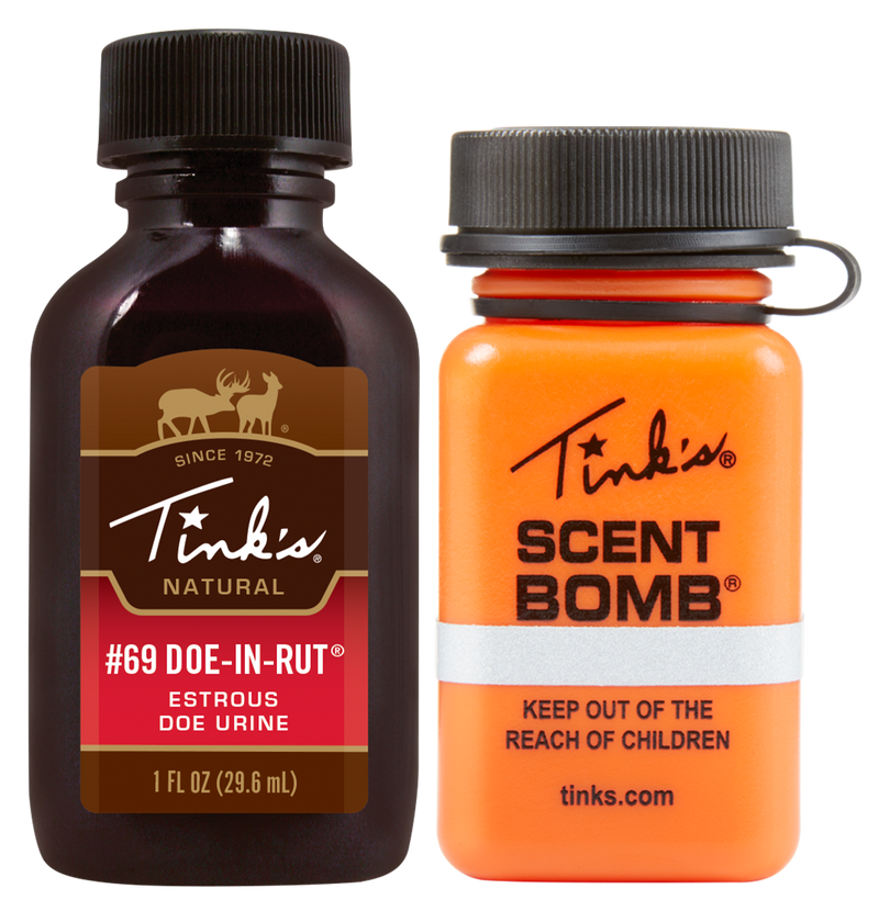 Tinks #69 is a 100% natural doe estrous urine deer attractant collected from live whitetail does during their estrous cycle. The 1oz squeeze bottle dispenses into included Scent Bomb wicks for all-day attraction during hunting season. This quality-controlled formula is designed for whitetail deer hunting and performs during the rut.