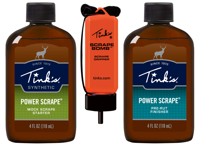 Tinks Power Scrape is an all-season deer attractant scent designed as a pre-rut finisher for mock scrape applications. The 4 oz bottle features a dripper dispenser for easy application. This product is formulated to attract deer during pre-rut hunting seasons.