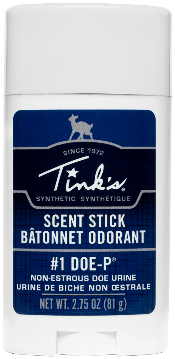 A synthetic deer lure scent stick designed to mimic doe pheromones and provide a calming effect for hunting applications. This 2.75 oz stick is part of Tinks' Scent Stick product line and is intended for use during deer hunting season. The synthetic formulation offers consistent scent delivery without live animal products.