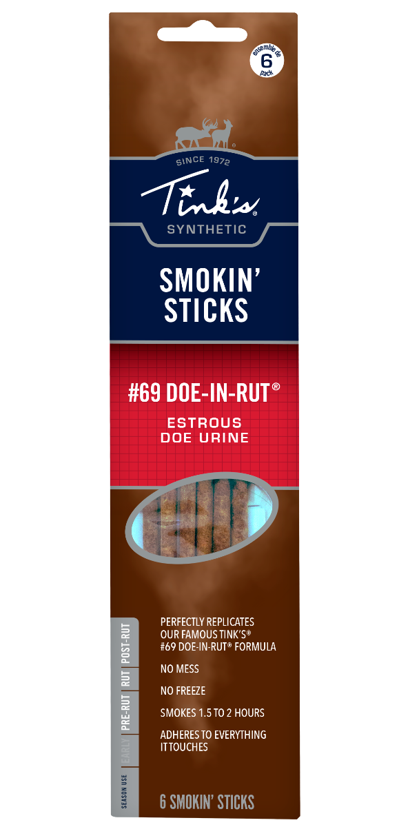Tinks Smokin Stick is a synthetic doe estrous urine attractant designed to lure deer during hunting season. Each package contains 6 scent sticks with an effective range of up to 2 hours. The sticks are easy-to-use scent dispensers ideal for deer hunting applications.