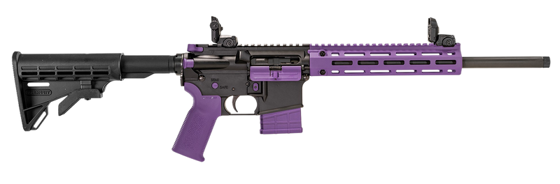 Semi-automatic AR-pattern rifle chambered in .22 LR with a 16" threaded barrel and 25-round capacity. Features M4 collapsible stock, front/rear flip-up sights, M-LOK compatible composite free-float handguard, and matte black finish with purple accents. Weighs 5 lbs with an overall length of 34.5".