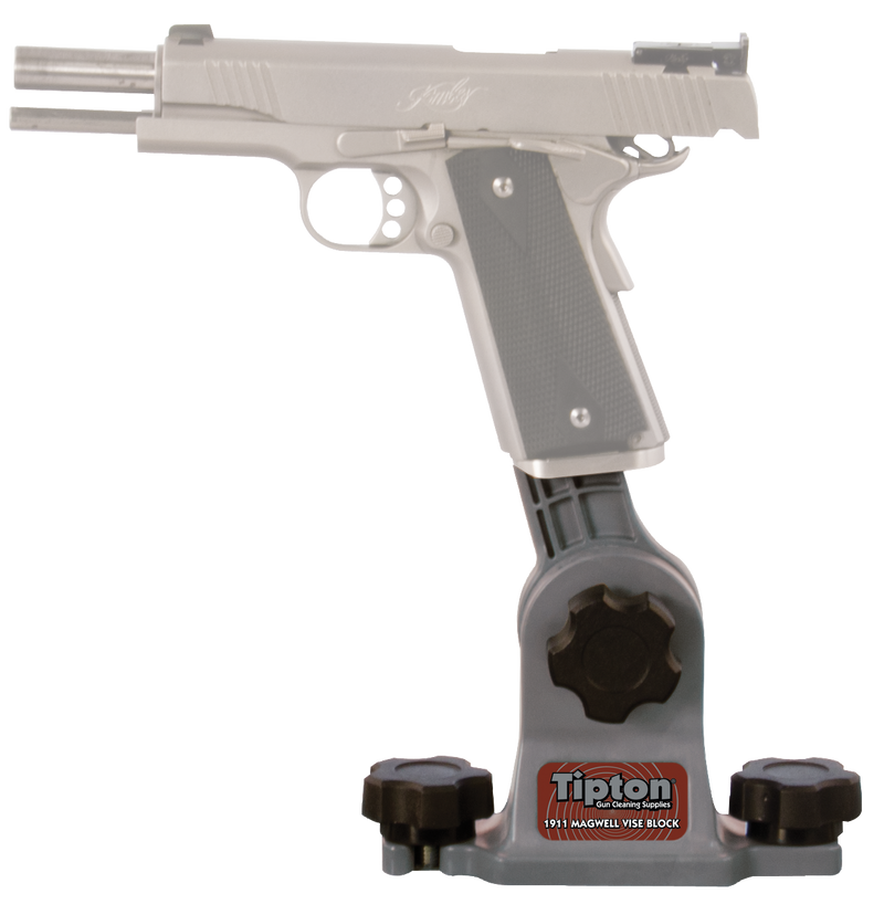 The Tipton 1911 Mag Well Vise Block is designed for use with the Tipton Best Gun Vise, sliding into the magazine well to provide a steady support base for cleaning and light gunsmithing operations on 1911 pistols. The center section rotates 180 degrees in 15-degree increments and locks into place, while the removable mag well arm allows clamping in a bench vise for additional rigidity. The solvent-resistant polymer construction is non-marring and includes fasteners for mounting to either the Best Gun Vise center rail or directly to a bench top.