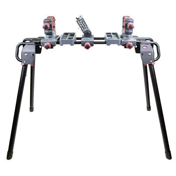 Free-standing collapsible gun vise with 4-leg system designed for firearm cleaning, maintenance, and accessorizing. Features non-marring glass-filled nylon clamp pads with ball and socket articulation, adjustable front and rear clamps, and 35" working height for comfortable seated or standing use. Weighs approximately 20 lbs and accommodates virtually any firearm or crossbow.