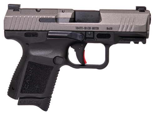 Canik TP9 Elite SC is a 9mm striker-fired semi-auto pistol with a 3.6" barrel and 15+1 capacity. Features green fiber optic front/U-notch rear sights, Warren Tactical Sights upgrade, slide cut-out for micro optics, and weighs 1.53 lbs. Includes IWB/OWB holster and two magazines (one 12rd, one 15rd).