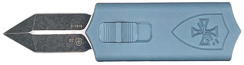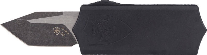 The Templar Excalibur Money Clip is a 1.90" OTF (out-the-front) knife featuring a D2 steel blade with plain edge and slider button deployment. It has a black aluminum handle, measures 5.2" to 6.0" overall length, and weighs 2.90 oz, making it a compact carry option.