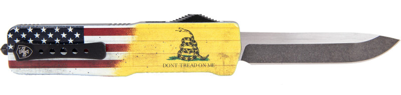 This Templar auto out-the-front knife features a 3.5" drop point blade made from D2 steel with an overall length of 9". The premium metal alloy handle includes a "Don't Tread on Me" design, glass break feature, and easy reset mechanism, with a ballistic nylon sheath included.