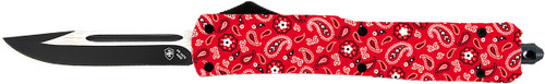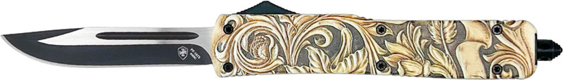 This is an automatic double-action out-the-front (OTF) knife featuring a 3" drop point blade made from 440C stainless steel and an overall length of 8.5". The camel-colored handle is constructed from premium metal alloy with a ballistic nylon sheath, and includes glass break functionality with easy reset mechanism.