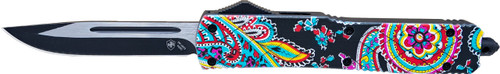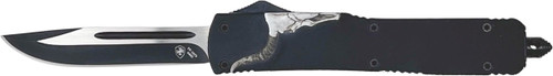 This is an automatic double-action out-the-front (OTF) knife featuring a 3" drop point blade made from 440C stainless steel and a premium metal alloy handle. It includes a glass break feature, easy reset mechanism, and comes with a ballistic nylon sheath. Overall length is 8.5".