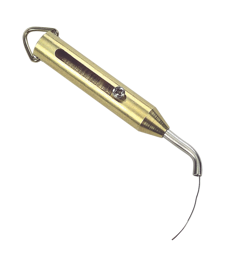 Retractable brass nipple pick designed specifically for in-line ignition rifles. Features a push-up slide mechanism that extends the pick at an angle to easily access and clean in-line rifle nipples. Compact design measures 5.2" in length when extended.