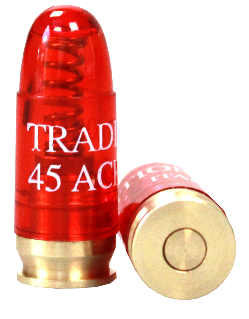 Traditions snap caps are dummy rounds designed for .45 ACP handguns and intended for training and dry-fire practice. These plastic rounds feature a brass base and come in a 6-pack, allowing shooters to safely cycle their firearms without live ammunition.
