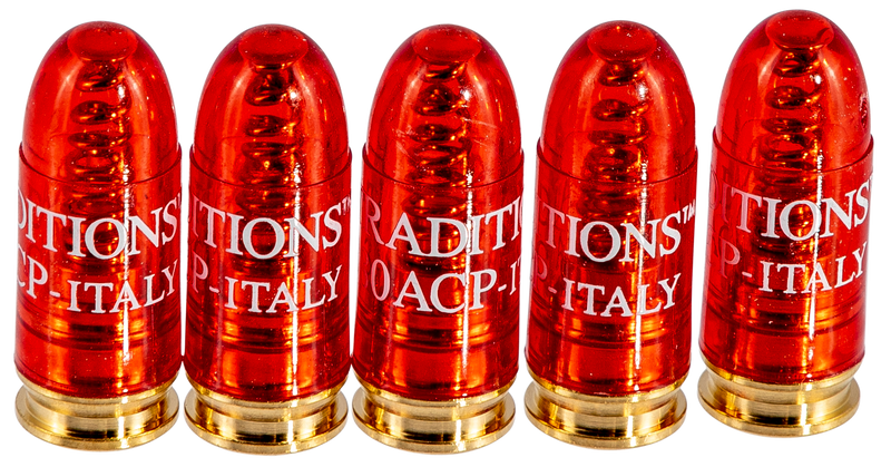 Traditions snap caps are dummy rounds designed for firearm training and function testing in .380 ACP caliber. Each pack contains 5 rounds with a plastic body and brass base, allowing safe dry-fire practice without live ammunition.