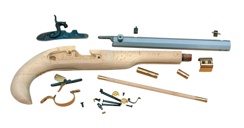 This is a .50 caliber percussion muzzleloader rifle kit featuring a 33.5" octagonal blued barrel with 1:66" twist and fixed sights. The kit comes pre-assembled at the factory with an unfinished select hardwood stock and uses #11 percussion caps for ignition. It's designed as a build-it-yourself project that weighs approximately 7.75 lbs and includes a 1-piece ramrod and brass trigger.