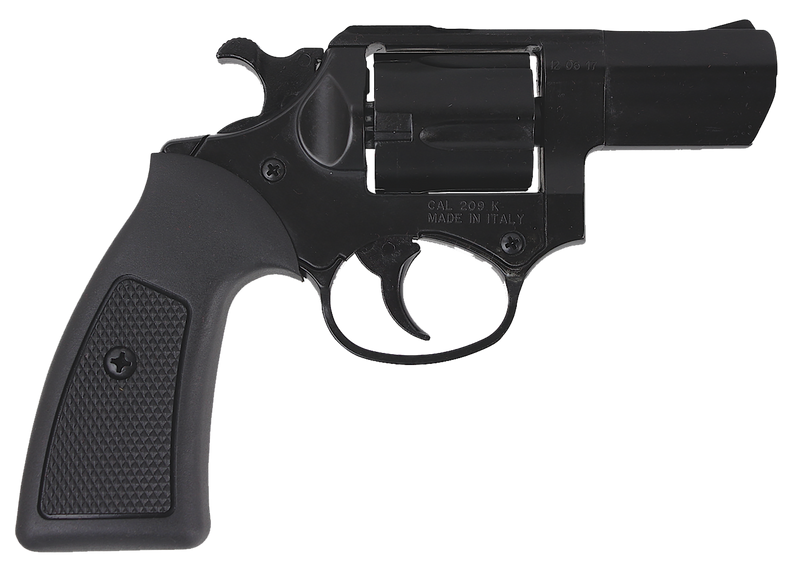 This is a blank starter pistol chambered in 209 shotgun primer with a 2" barrel and 5-round capacity, designed for frequent competitive use. The revolver features a solid barrel with a red plug for safety identification, swing-out cylinder, and black polymer grips with a DA/SA action and transfer bar safety. It comes with a foam-lined plastic carrying case and measures 9.4" overall with a 6.2" width.