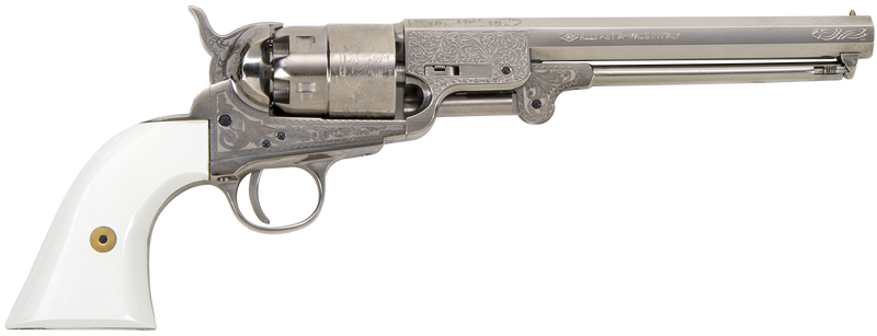 This Traditions 1851 Navy is a break-open percussion revolver chambered in 44 caliber with a 7.5" octagon barrel and 6-shot capacity. Features a nickel-engraved finish with simulated ivory grips and blade front sights, weighing 2.7 lbs. A commemorative-style replica distinguished by its classic Civil War era design.