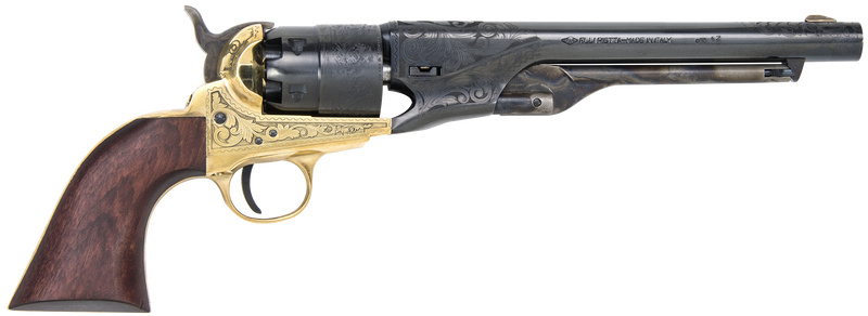 The Traditions 1860 Army is a .44 caliber break-open revolver with an 8" blued barrel, blued cylinder, and brass engraved frame paired with a walnut grip. This 6-shot percussion revolver features top strap/post sights and weighs 2.75 lbs, making it suitable for hunting and target shooting. A historically-inspired design based on the iconic Civil War-era sidearm.