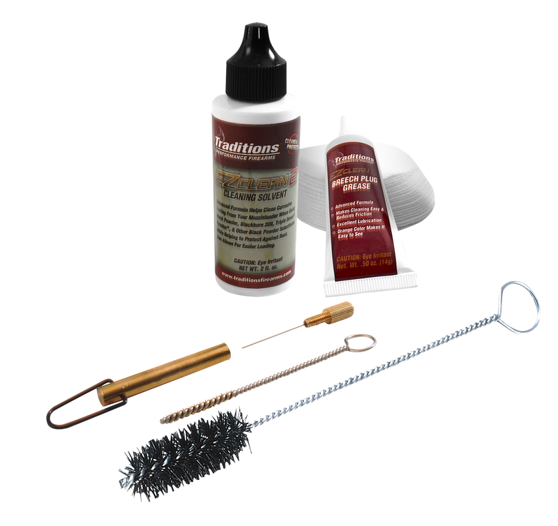 This 6-piece cleaning kit is specifically designed for maintaining .50 caliber muzzleloader breech plugs and breech areas. It includes brushes, cleaning solution (EZ Clean 2 formula), and patches to remove fouling and residue from black powder, black powder substitutes, and modern propellants. The kit contains hazardous materials and is not approved for air shipment.